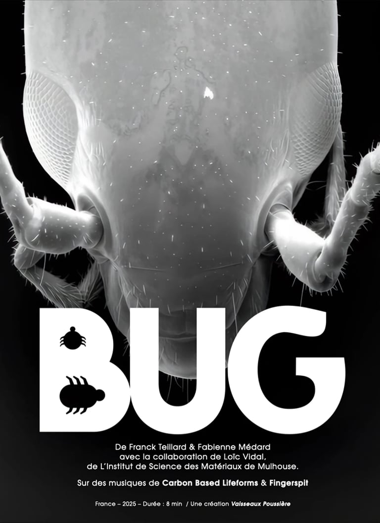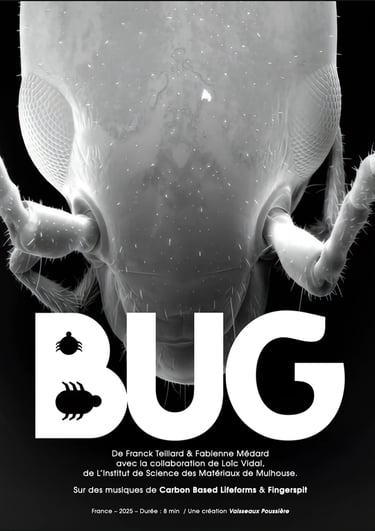 BUG est un court métrage hybride de 8 minutes, en cours de finalisation, qui explore les frontières entre science, art, poésie et technologies. À partir d’images réelles captées au microscope électronique à balayage, le film observe les textures et reliefs du monde microscopique des arthropodes. Réanimés numériquement, ces fragments du réel se transforment en un théâtre étrange, à la lisière du vivant et de l’artifice.