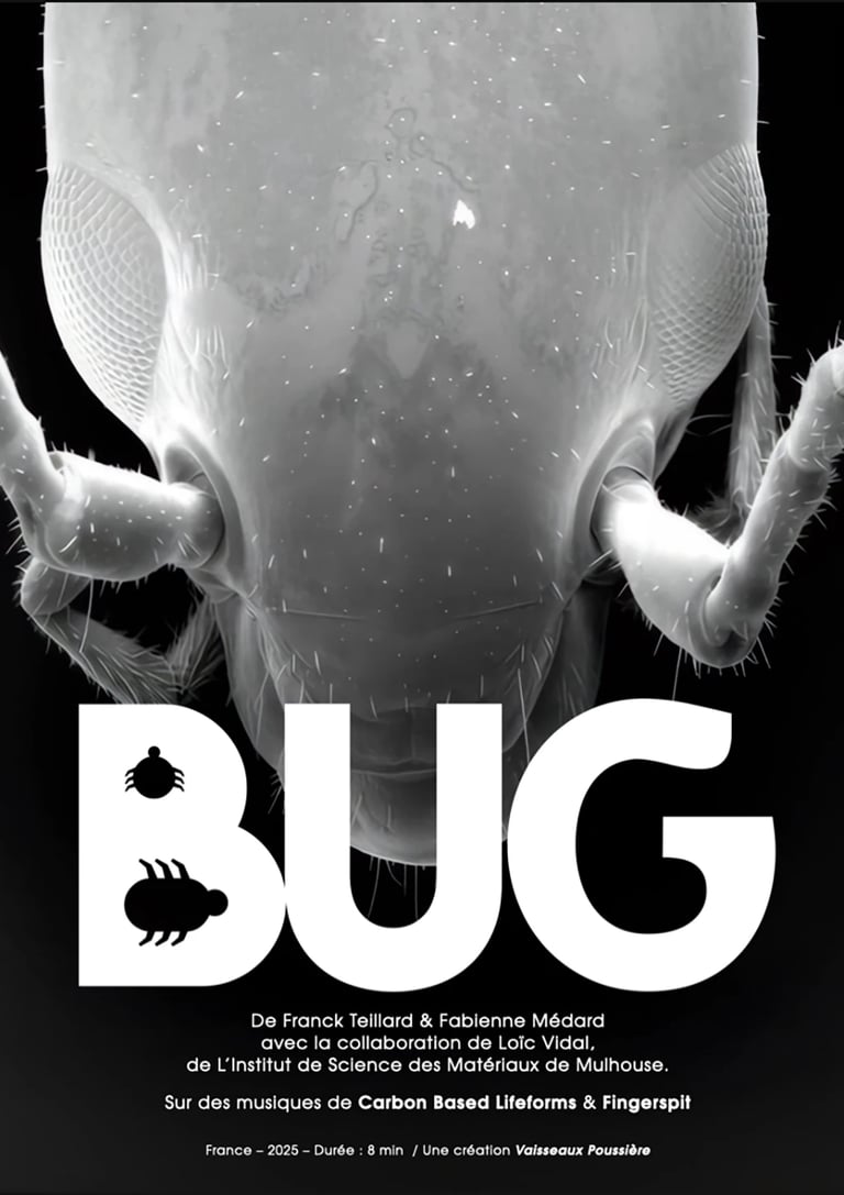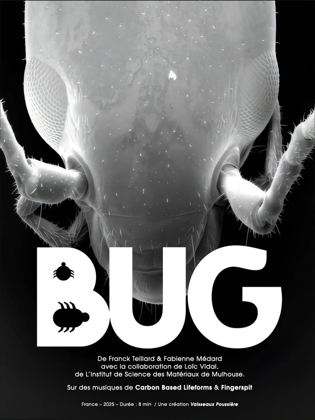 BUG est un court métrage hybride de 8 minutes, en cours de finalisation, qui explore les frontières entre science, art, poésie et technologies. À partir d’images réelles captées au microscope électronique à balayage, le film observe les textures et reliefs du monde microscopique des arthropodes. Réanimés numériquement, ces fragments du réel se transforment en un théâtre étrange, à la lisière du vivant et de l’artifice.