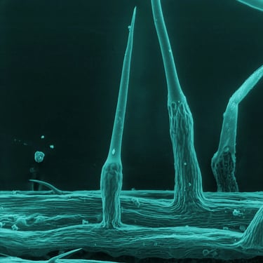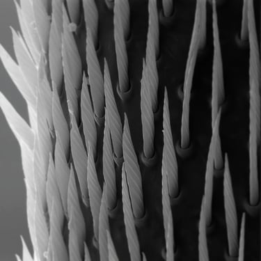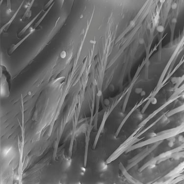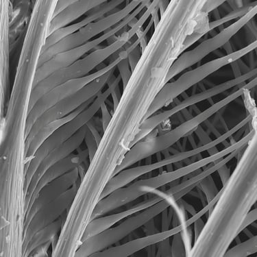 Une aile de papillon, une plume, une fibre ou un pollen… À l’aide d'un microscopie électronique qui rend visible l’invisible, Vaisseaux Poussière explore ce que la nature offre de plus secret et de plus fragile. Ces images proviennent du réel et respectent l’intégrité des éléments observés. Elles résultent d’un travail patient de collecte, de préparation, d’observation en laboratoire, rendus possibles grâce à Loïc Vidal, de l’Institut de Science des Matériaux de Mulhouse.