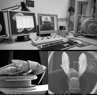 Les images proviennent du réel et respectent l’intégrité des éléments observés. Elles naissent d’un travail patient de collecte, de préparation et d’observation en laboratoire. Le microscope électronique à balayage (MEB) explore les surfaces point par point et révèle, à l’échelle du micromètre, la complexité des structures naturelles. Une fois révélées, ces images sont réanimées numériquement à l’aide d’outils génératifs. Les fragments observés deviennent un théâtre visuel singulier, à la lisière du vivant et de l’artifice, pour approcher autrement le monde de l’infiniment petit. Le court-métrage BUG, actuellement en cours d’achèvement, en constitue une première illustration.